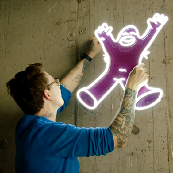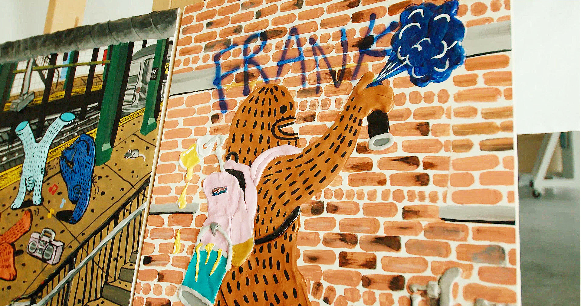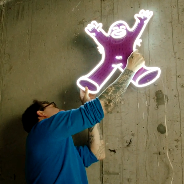 Des fresques murales aux écrans lumineux, Frank Ape vit en couleur - son message d'espoir et de communauté apparaît dans des endroits inattendus.