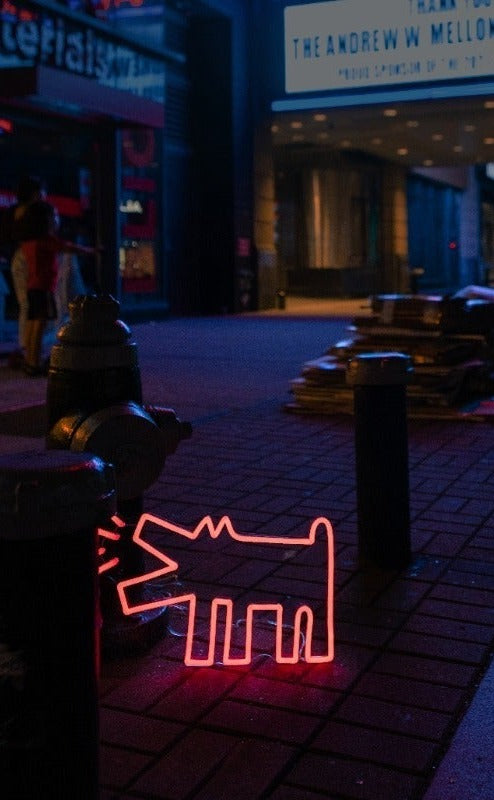 Plongez avec nous dans le New York électrique des années 80, et découvrez les huit designs les plus emblématiques de l’artiste revisités en néons LED pop et colorés.
