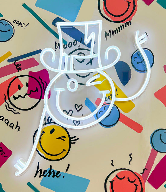Les amusants M. et Mme A, un magicien avec un chapeau haut de forme et un personnage dansant sont combinés avec des traits de l'emblématique Smiley pour créer 5 néons LED qui égayeront l'espace de votre enfant ! Que ce soit dans la salle de jeux ou dans leur chambre, ces oeuvres sont parfaites pour créer un espace coloré et créatif que votre enfant adorera.