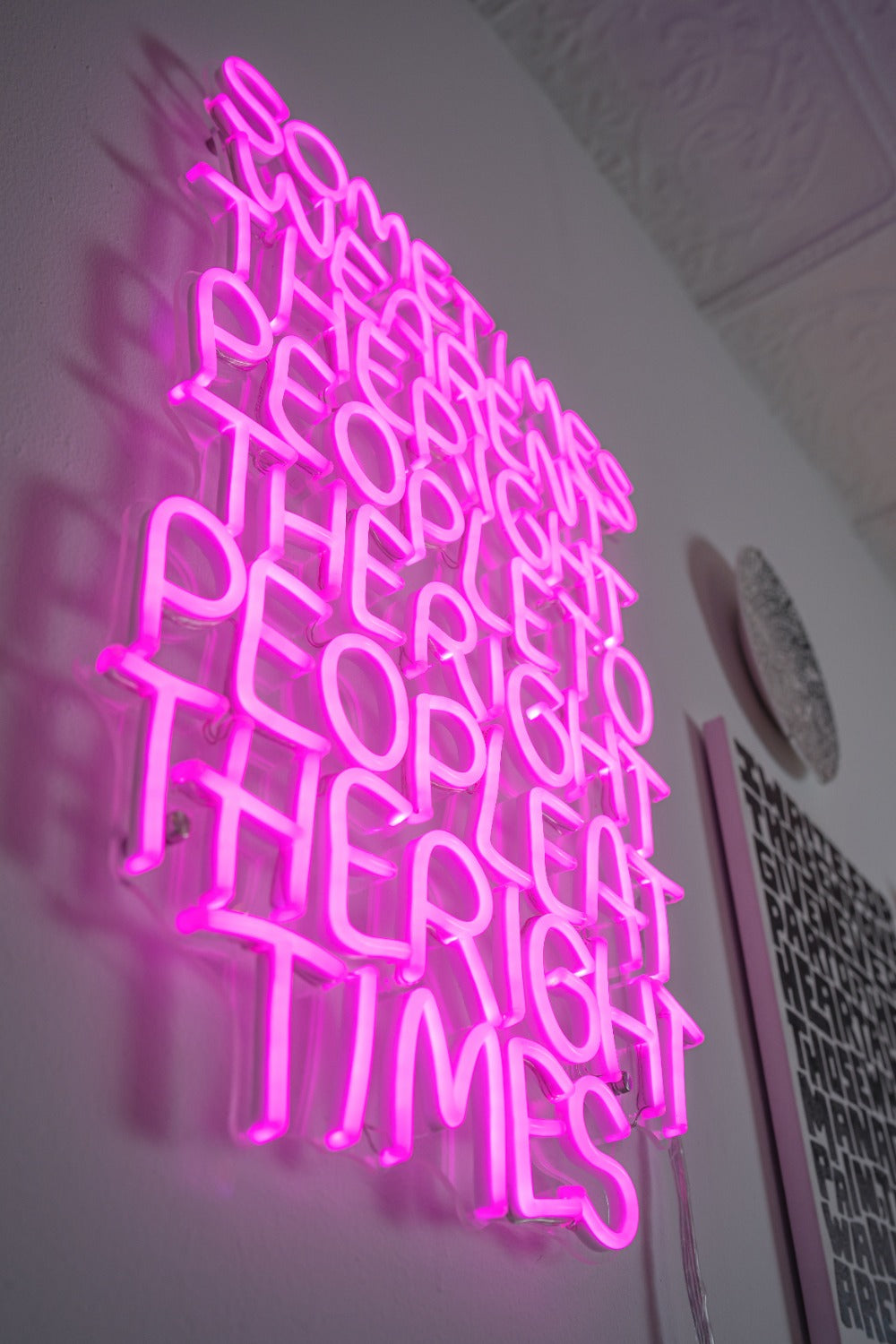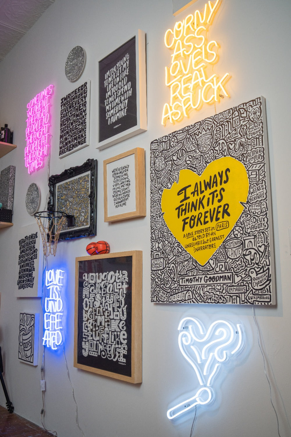 Timothy travaille à la fois dans le monde commercial et dans celui des beaux-arts, ce qui rend sa créativité très accessible. Cette collection combine les deux en transformant ses écrits personnels en néons vibrants pour votre maison !
