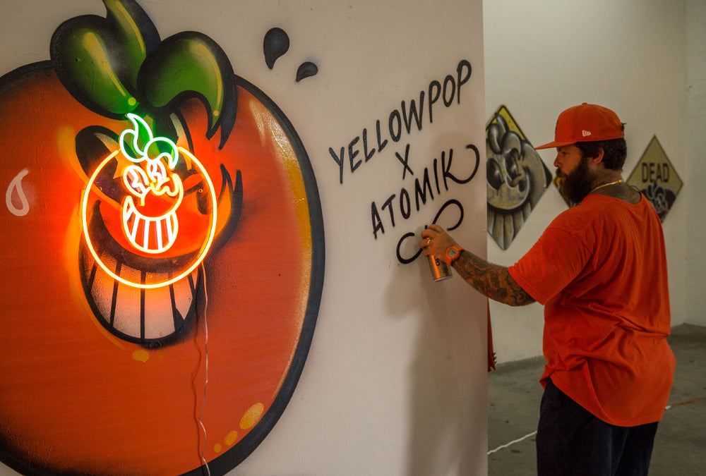 ATOMIK ist ein in Miami ansässiger Künstler. Ausgebildet in Grafikdesign, ist ATOMIK eine wichtige Figur in der Kunstszene von Miami. Da er in den 80er Jahren in der aufstrebenden Graffiti-Szene Miamis aufwuchs, wurde er selbst schon in jungen Jahren Zeuge dessen, was später zu seinem Beruf werden sollte. Der Künstler, der für seine ikonische orangefarbene Figur berühmt ist, die als Reaktion auf den Abriss des Miami Orange Bowl entstand, prägt auch die Wände von Miami mit seinen klaren Stilen, Graffitis und Kalligrafien. Seine unverwechselbare orangefarbene Figur wurde in allen Ecken der Welt platziert und bringt ein Stück Miami an Orte wie Chile, Peru, Kolumbien, Brasilien, Argentinien, Mexiko, die Niederlande, Deutschland, Italien, Spanien, England, Australien, Korea und Thailand.
