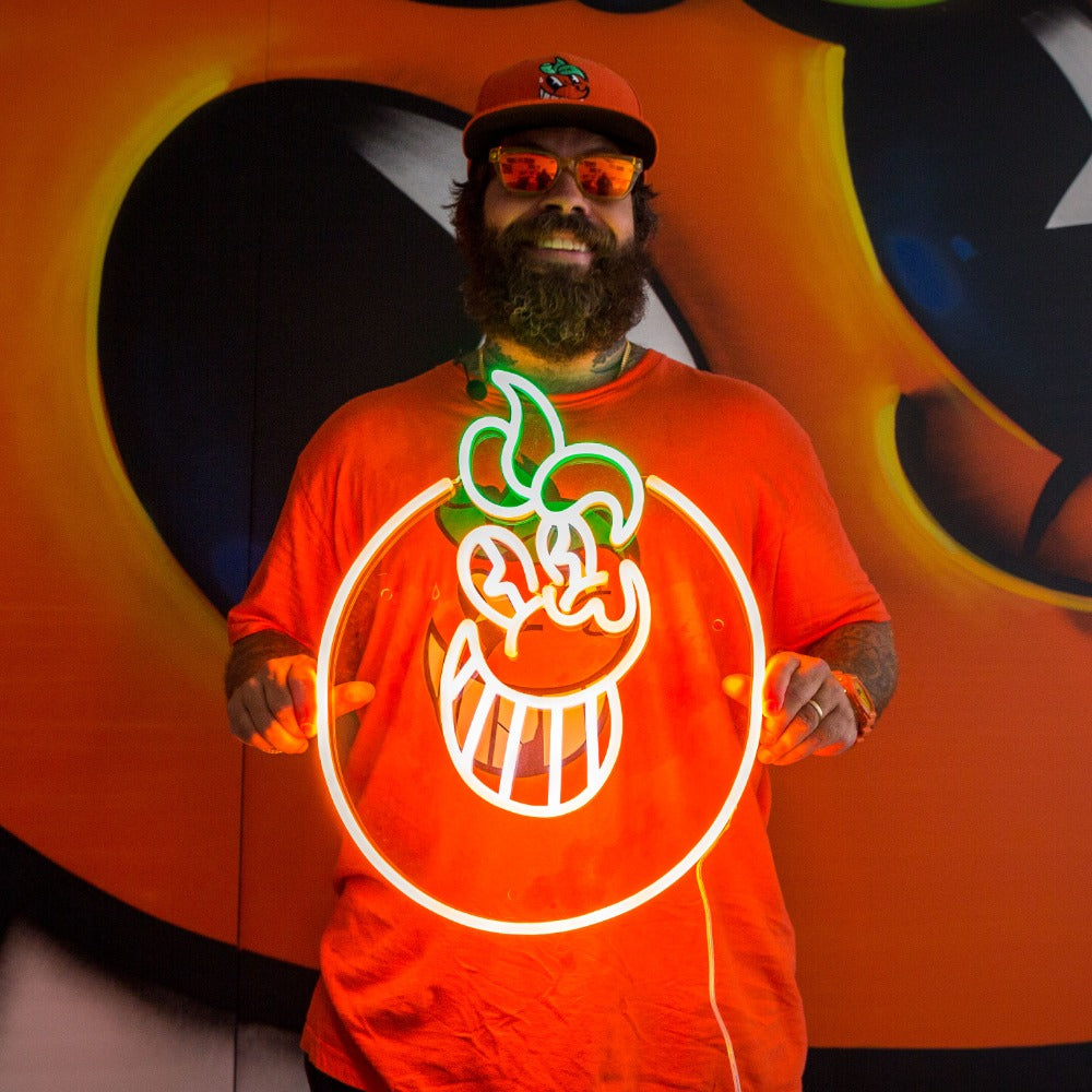 Dieses leuchtend orangefarbene Zeichen fängt jedes Detail wunderschön ein; von ATOMIKs ansteckendem Lächeln bis hin zum Funkeln in seinen lebhaften Augen - alles in einem elektrisierenden Licht, das dich hypnotisieren wird.