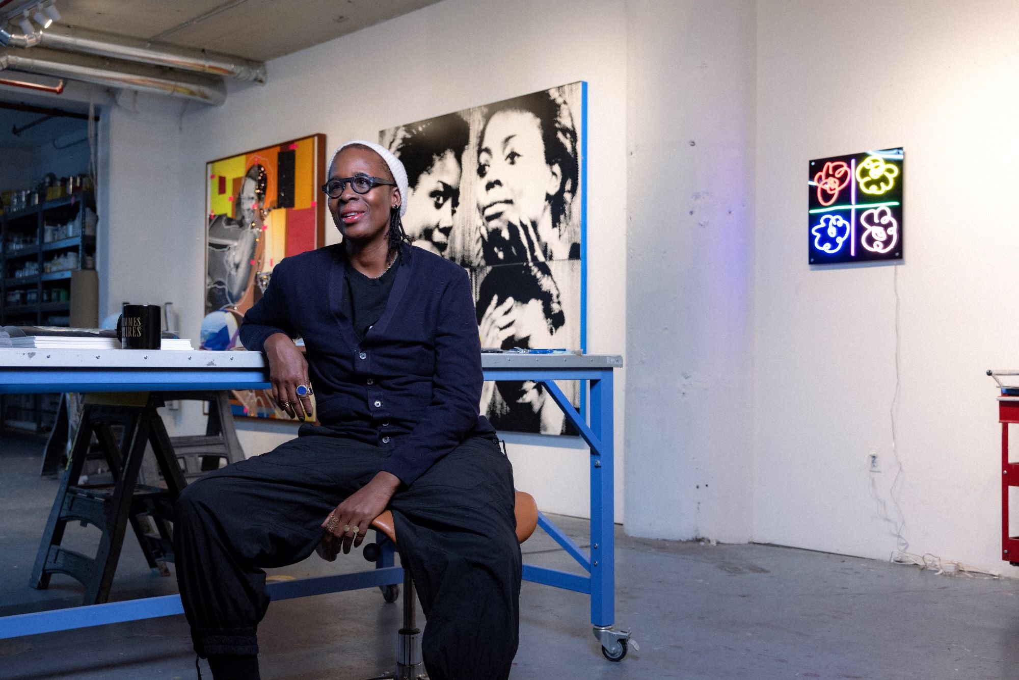 Mickalene Thomas ist eine international bekannte multidisziplinäre Künstlerin, die für ihre eindringlichen Porträts schwarzer Frauen bekannt ist, die oft mit Strass, Acryl und Emaille verschönert sind. Indem sie die Themen Identität, Rasse und Geschlecht erforscht, hinterfragt ihr Werk die schwarze weibliche Identität und ihre Komplexität innerhalb der westlichen Kultur. Als Tony Award-nominierte Co-Produzentin, Kuratorin, Pädagogin und Mentorin schrieb Thomas 2023 Geschichte, als sie die erste schwarze queere Künstlerin wurde, die ein Stipendium der Yale University auf ihren Namen erhielt. Ihre Arbeiten sind in renommierten Sammlungen wie dem MoMA, dem Whitney und dem Smithsonian vertreten.
