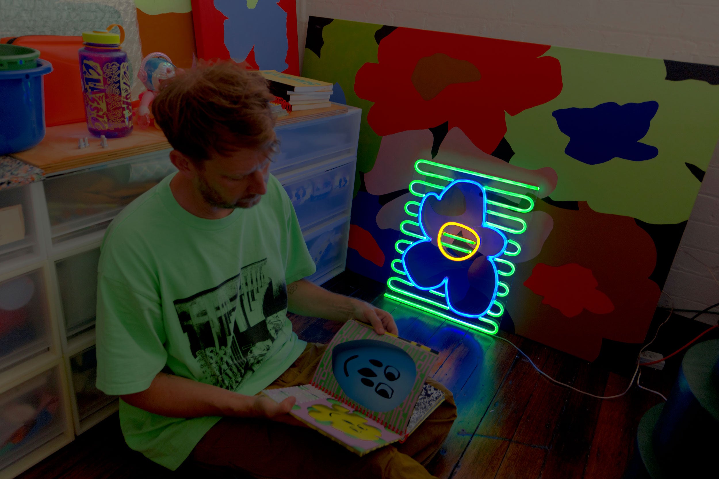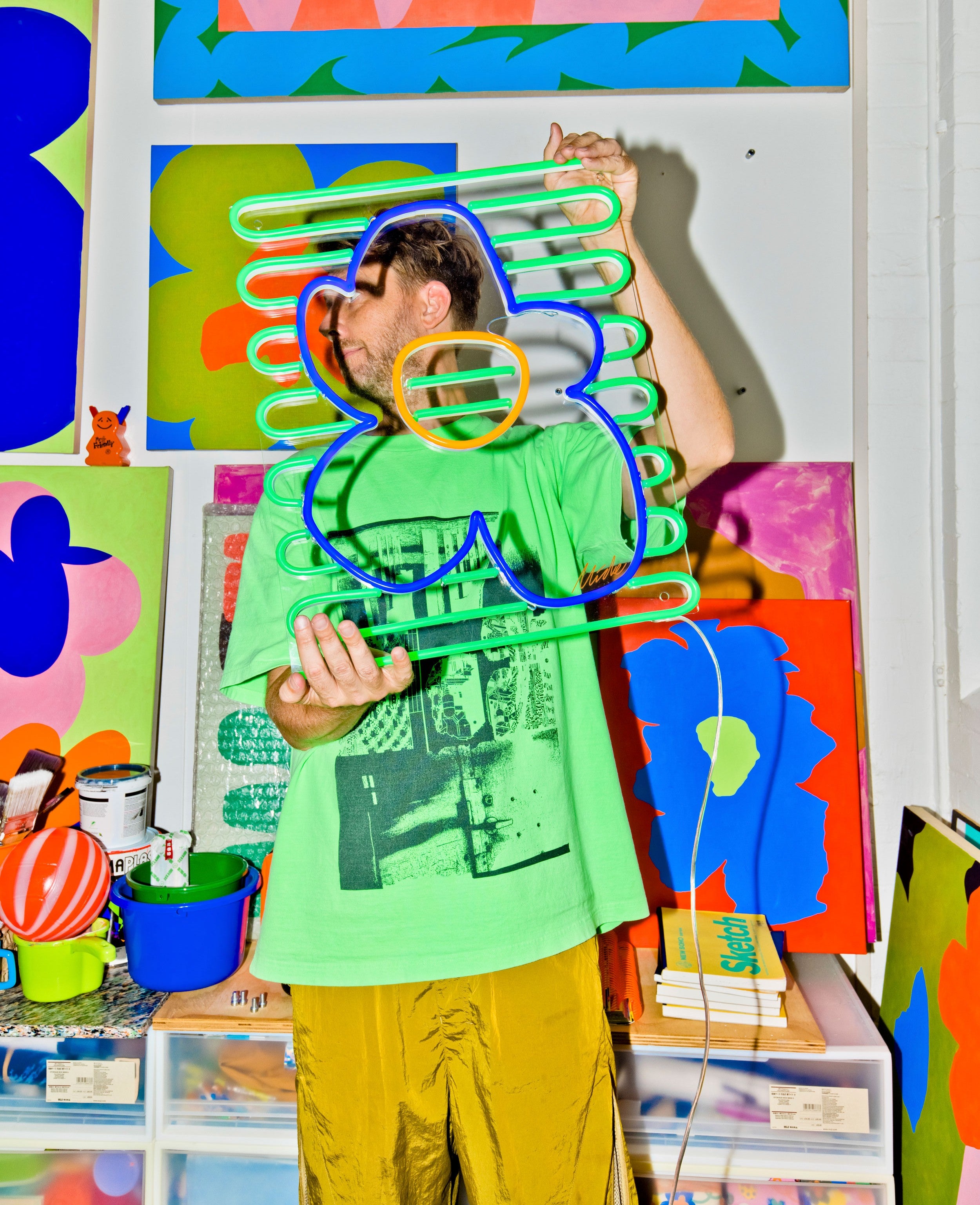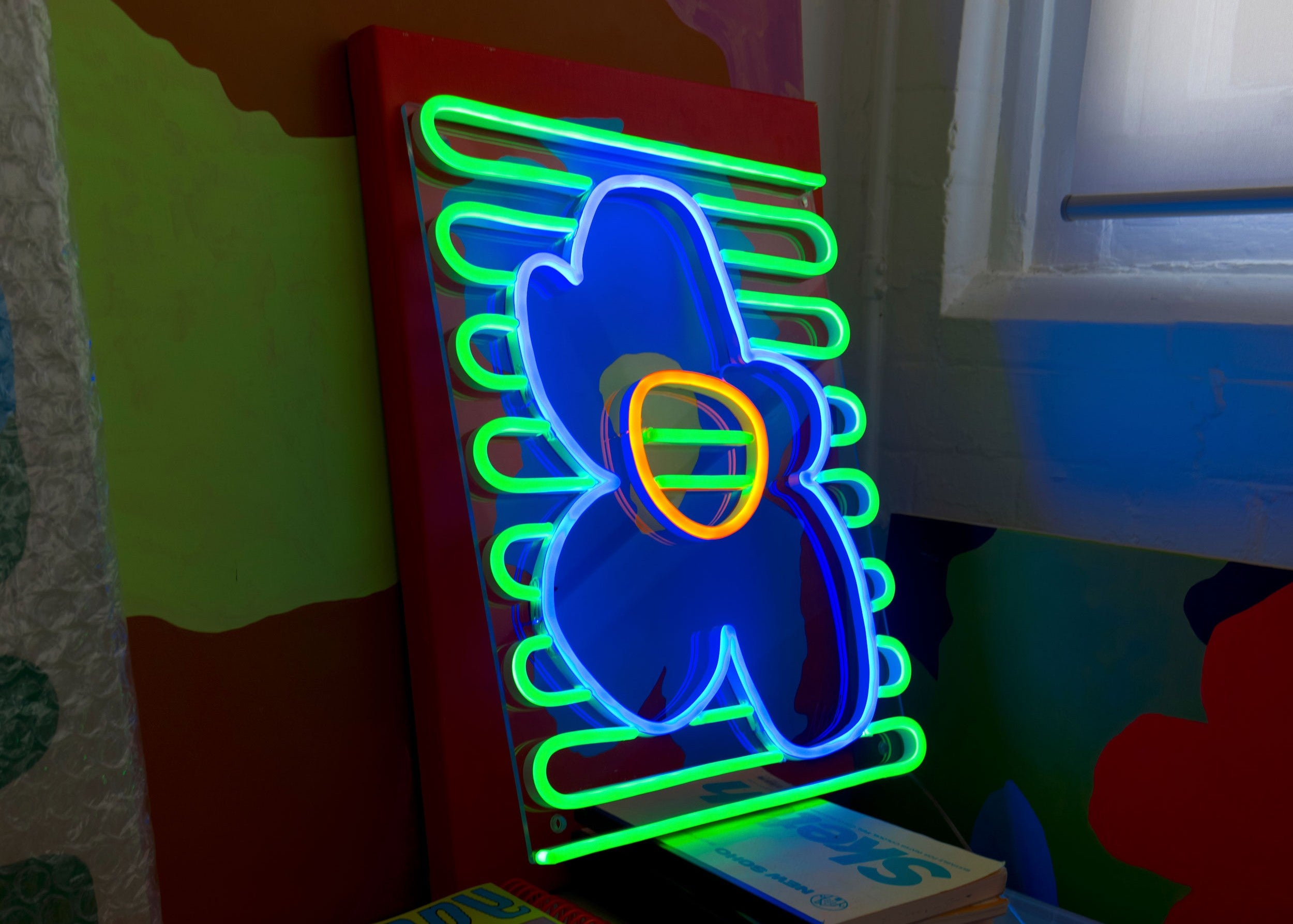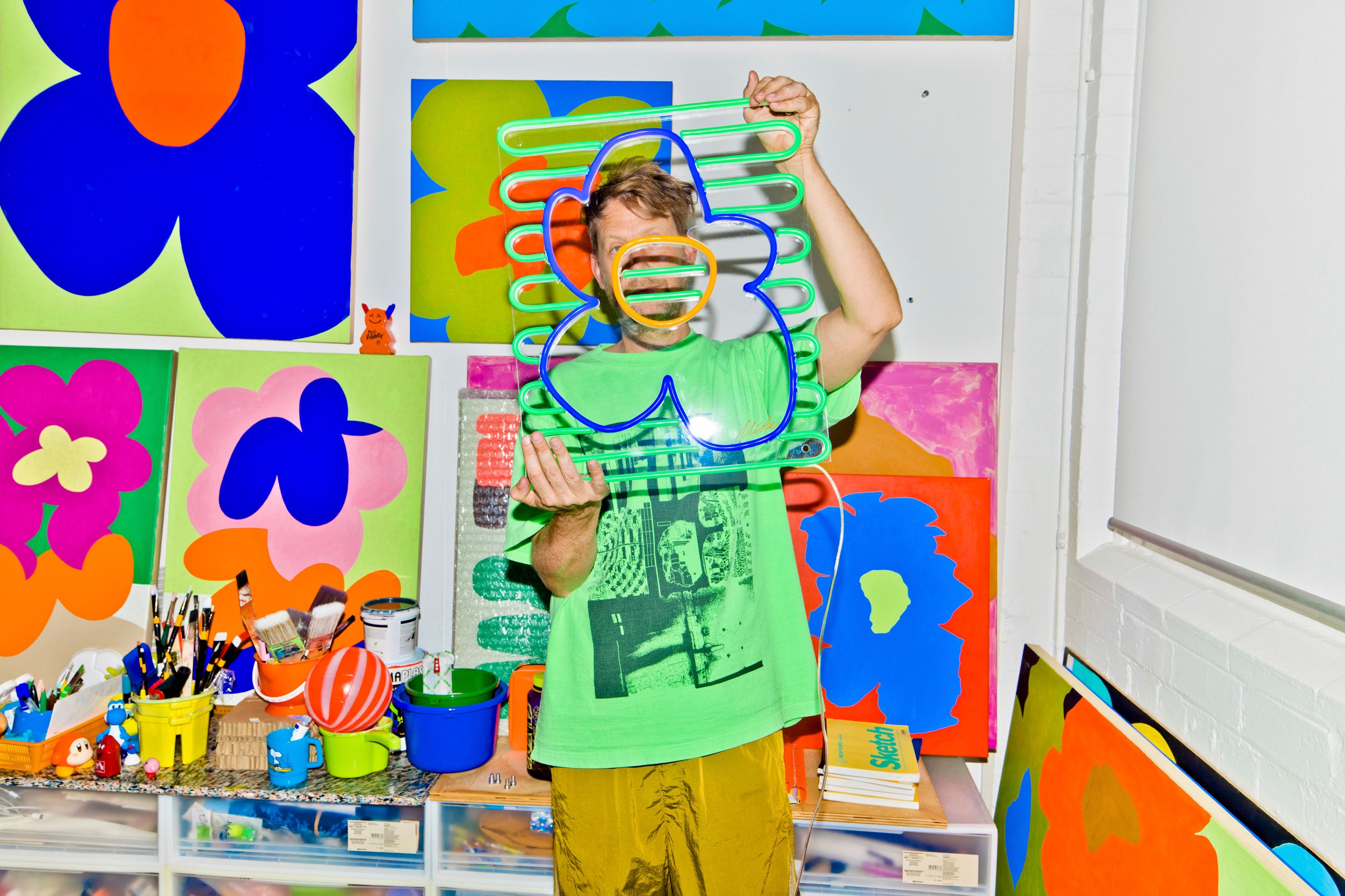 Micke, der für seinen gewagten Einsatz von Neon und Acryl bekannt ist, erweckt seine strahlende Welt mit Blue Flower zum Leben, einer strahlenden Blume, die bei Tag und Nacht leuchtet.