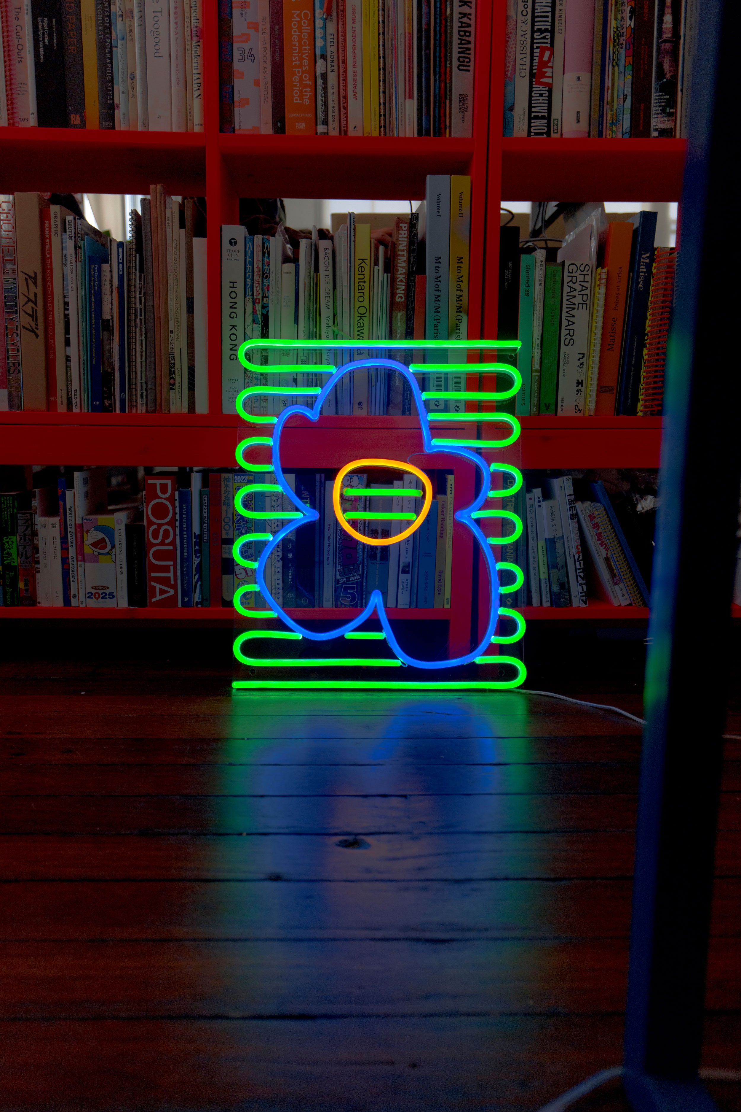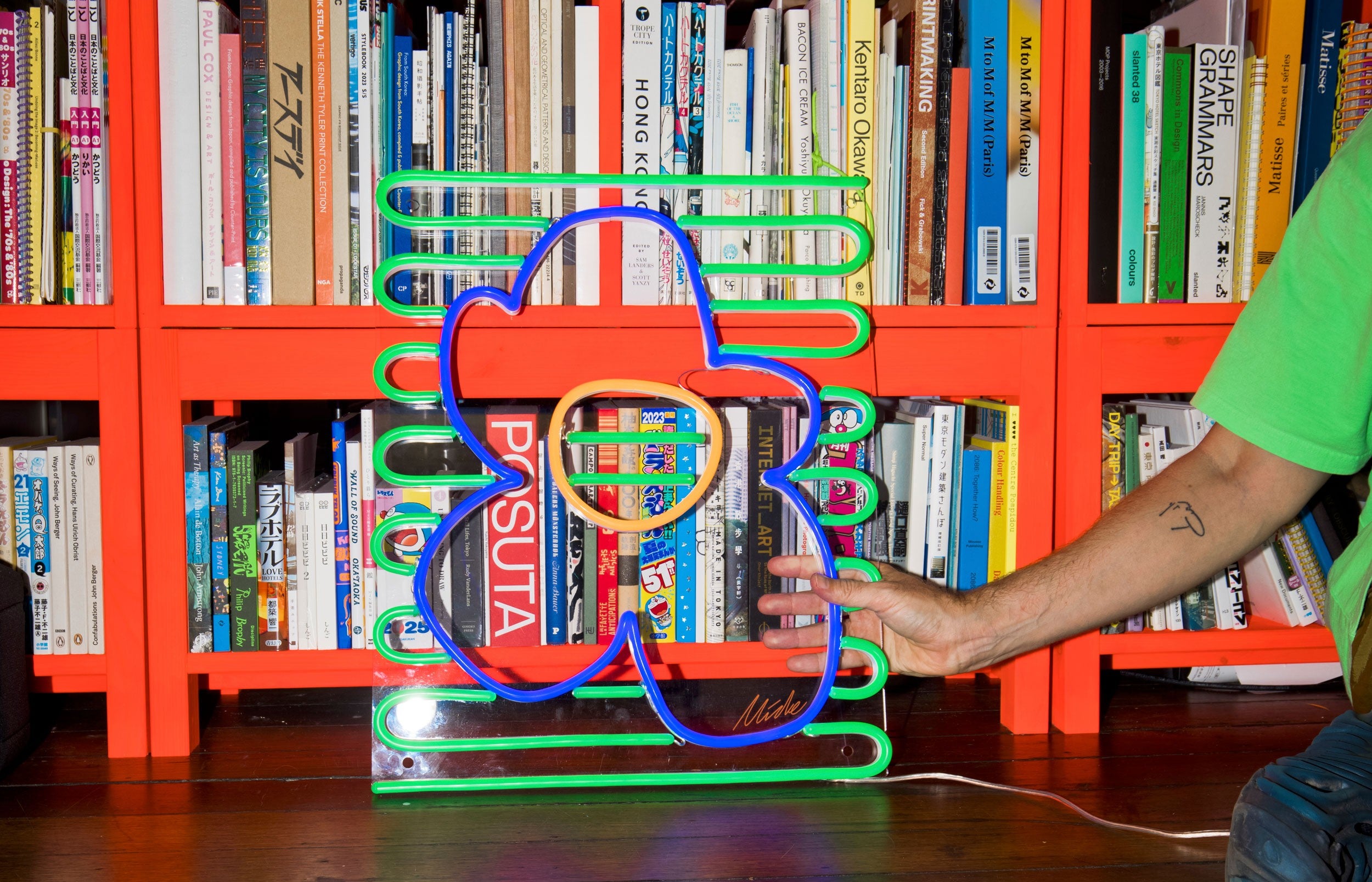 Mit ihren verspielten Formen und der meisterhaften Balance von Kontrasten fängt diese Neonschrift die Freude und den Rhythmus von Mickes Signature-Style ein.