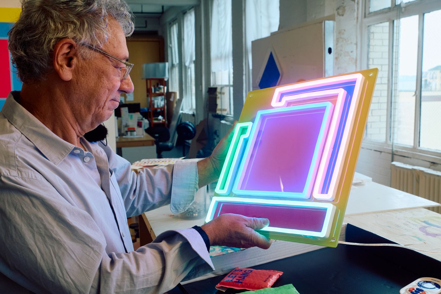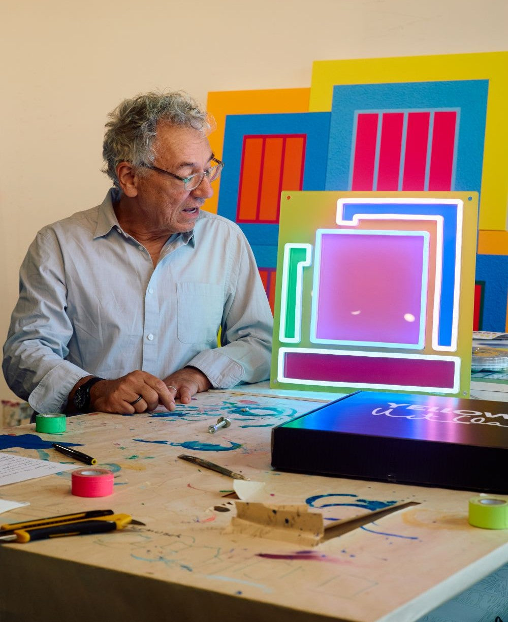 Peter Halley est un artiste américain majeur qui a marqué un tournant décisif dans l’art contemporain depuis les années 1980. Reconnu pour ses peintures géométriques mêlant cellules, conduits et couleurs fluorescentes, il explore à travers son langage visuel singulier des thèmes tels que l’isolement, la technologie et les structures sociales. Son œuvre combine théorie et forme, nourrie par le minimalisme, le post-structuralisme et l’architecture de la vie moderne. L’influence de Halley dépasse largement la toile : il est aussi écrivain, éditeur et enseignant, et ses créations figurent dans des institutions de renom comme la Tate Modern, le MoMA ou le Whitney Museum. Avec Yellowpop, ses motifs emblématiques sont réinterprétés en pièces lumineuses en LED néon, projetant ses symboles iconiques dans une nouvelle dimension faite de lumière et d’espace.