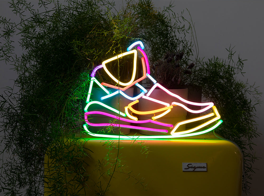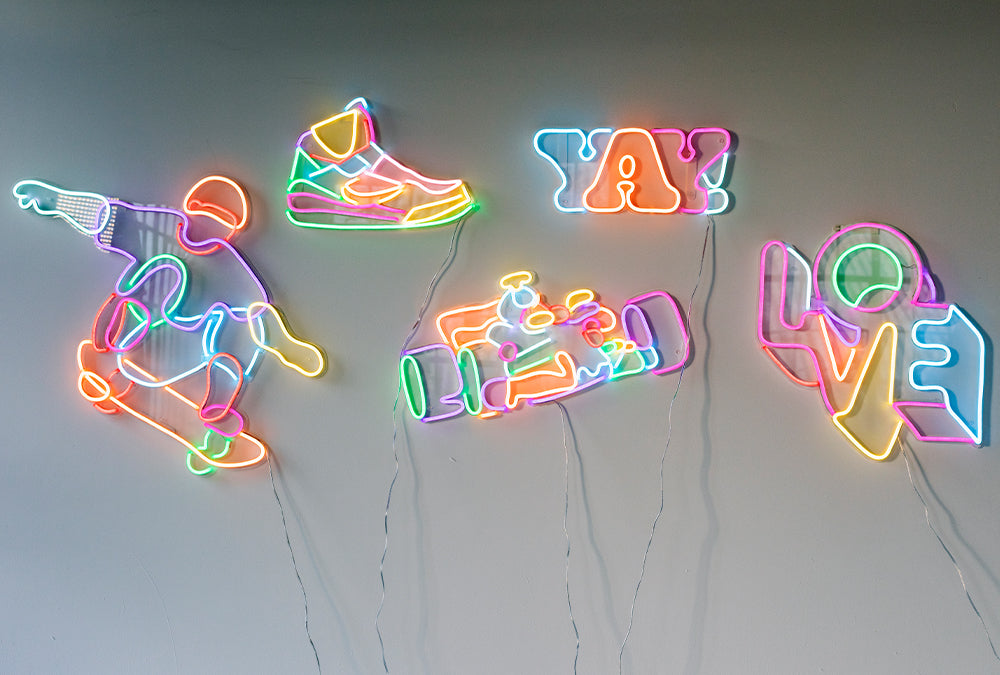 Tauche mit uns in Yonis lustige und farbenfrohe Welt ein und entdecke seine unglaublichen Designs neu interpretiert in LED-Neon.