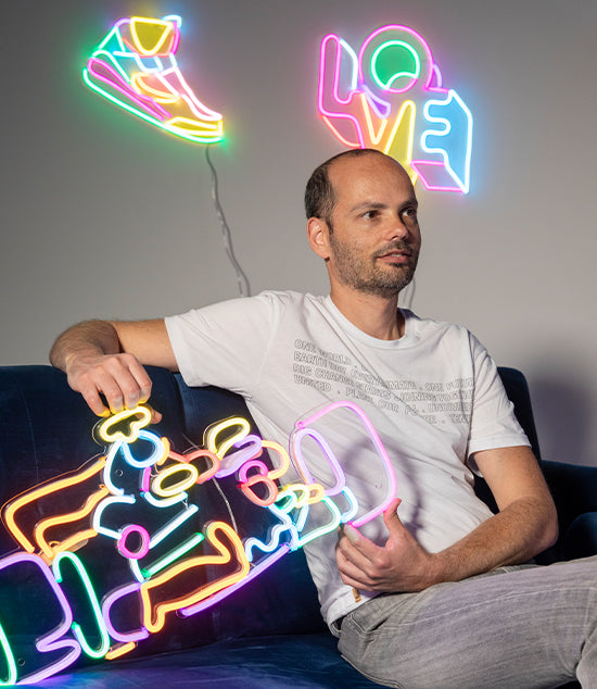 Der Künstler lädt uns in seine Welt ein, in der er immer wieder spielt und Spaß hat! Für diese farbenfrohe Kollektion von LED-Neonröhren hat er einige seiner emblematischen Kreationen abgebildet: Wörter... Aber nicht nur!