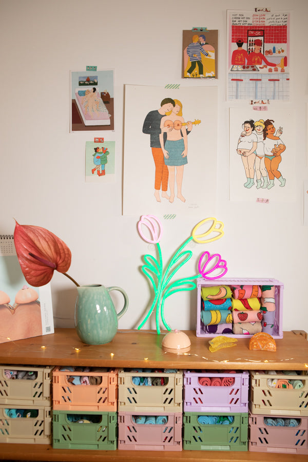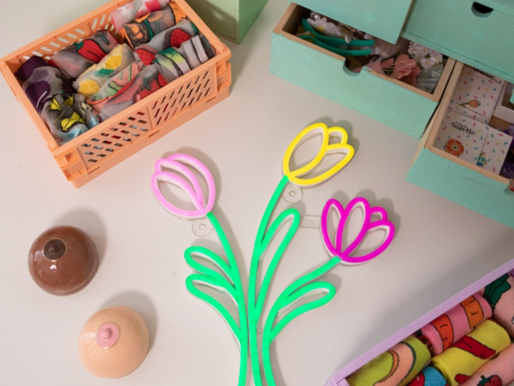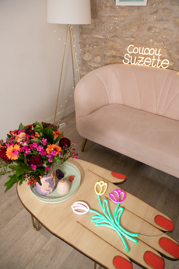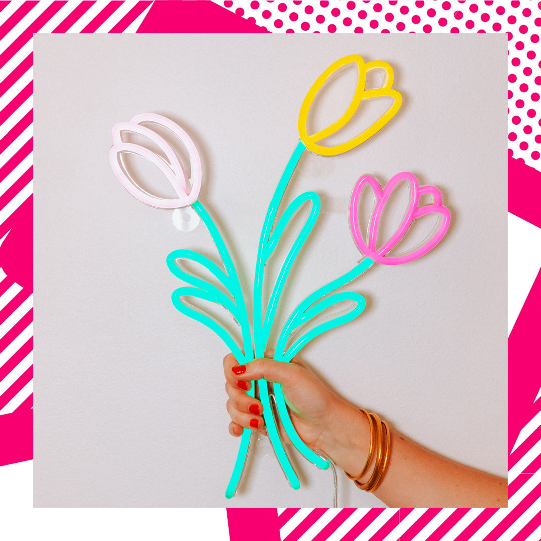 La tulipe est la fleur favorite de Juliette ! Et c’est la raison pour laquelle elle a choisi de réaliser cet incroyable néon LED ; un bouquet de tulipes aux couleurs printanières qui vient illuminer le mur de son atelier de la plus jolie des façons.
