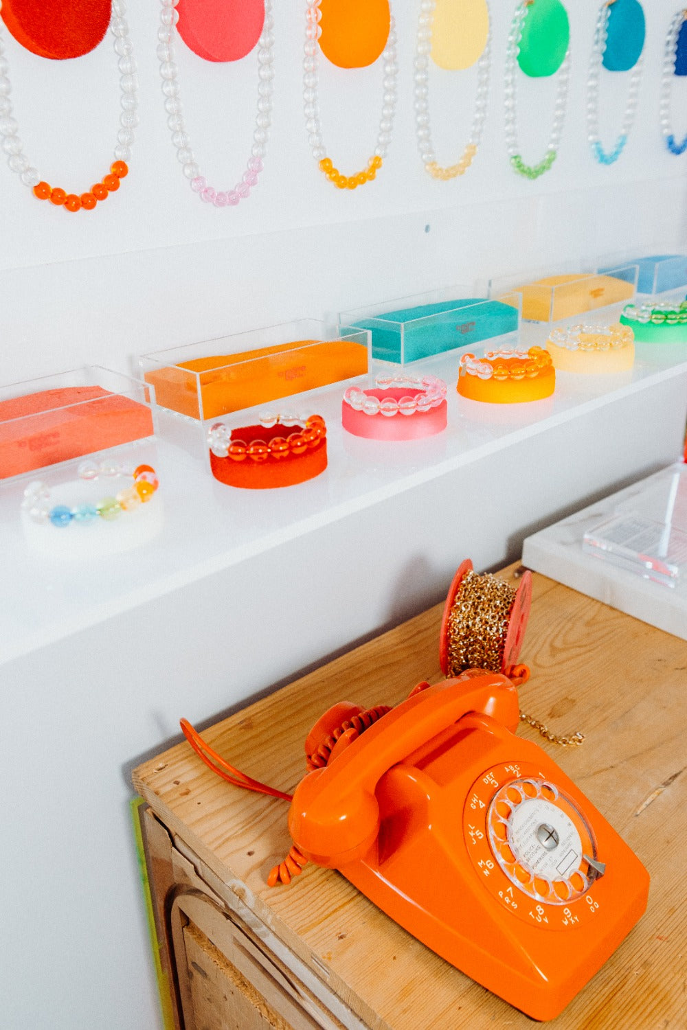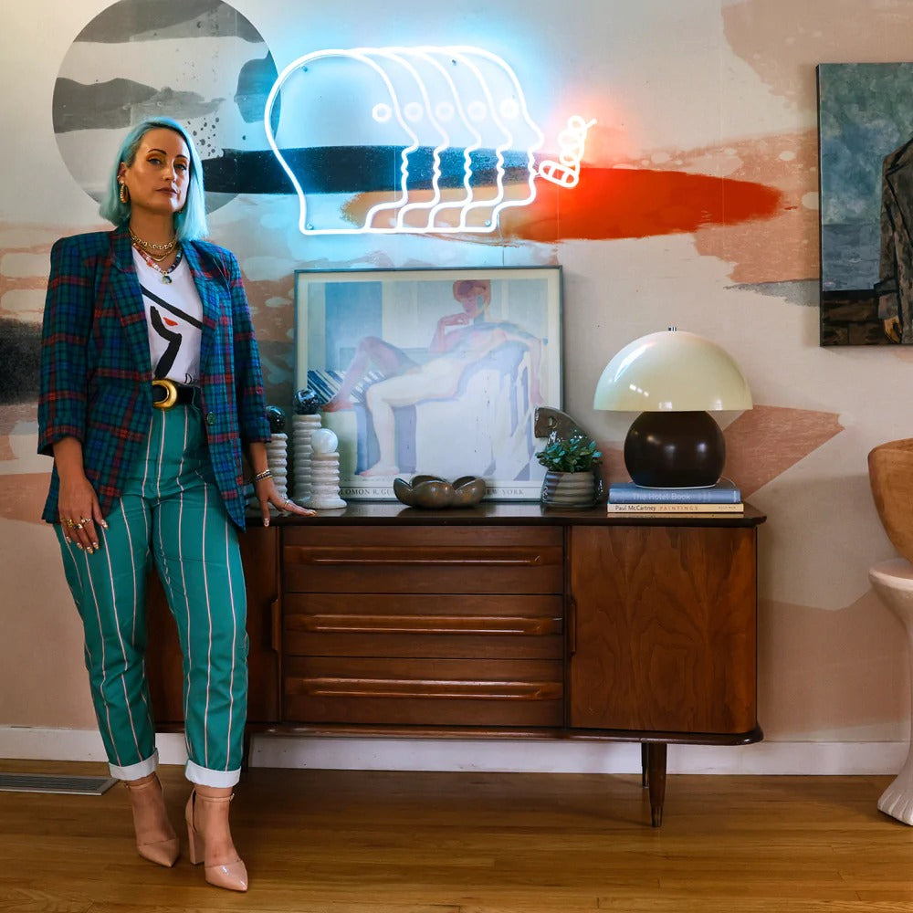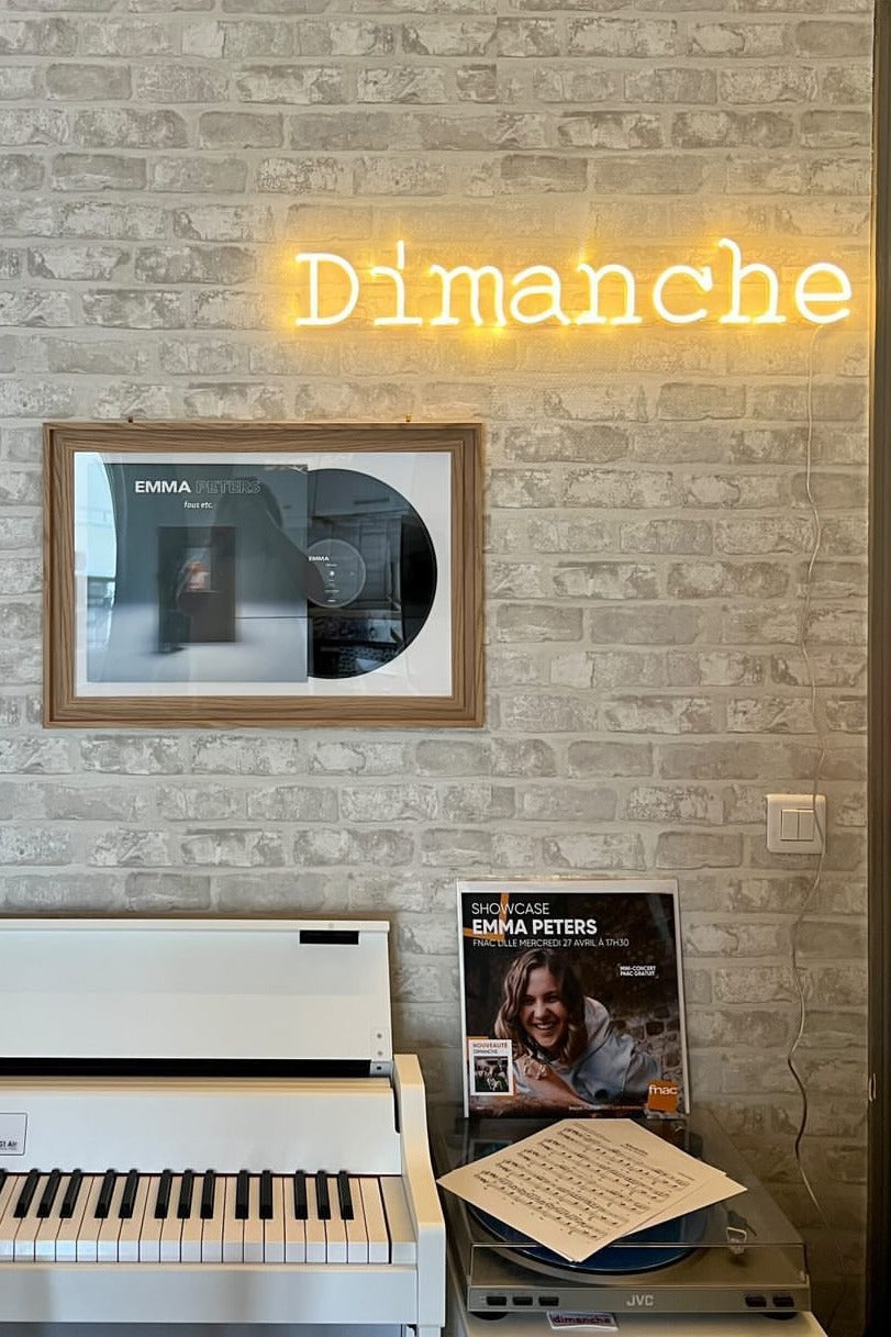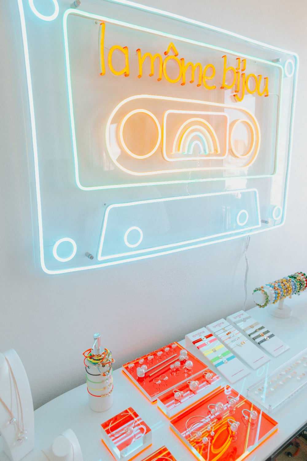 Et pour son atelier, elle a recréé un néon reprenant le logo de sa marque “La Môme Bijou” au sein d’une cassette aux couleurs flamboyantes.