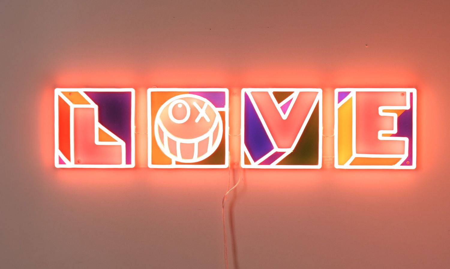 L.O.V.E ist ein modulares LED-Panel mit einem UV-Farbdruck und einem rosafarbenen LED-Glühen.