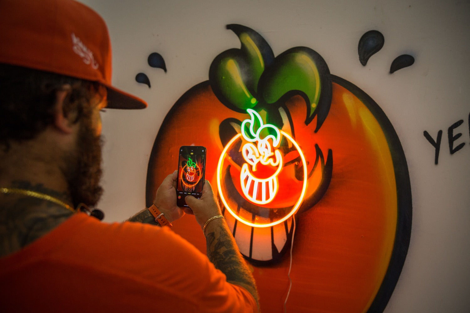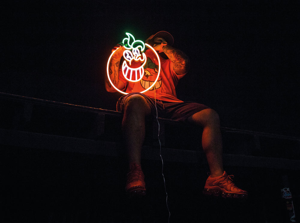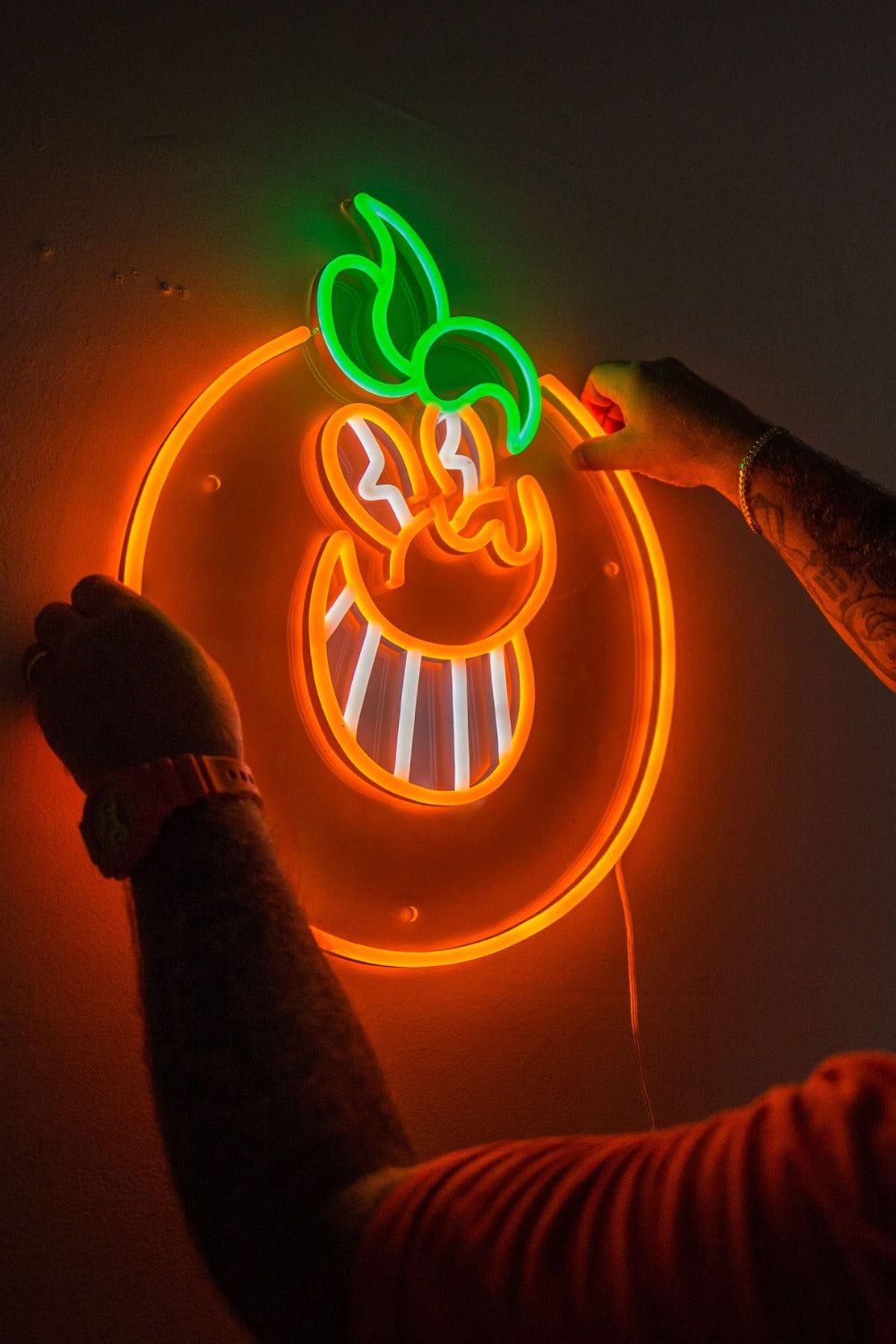 This bright orange sign beautifully captures every detail; from ATOMIK's infectious smile to the sparkle in her vivid eyes - all illuminated with an electrifying light that will leave you mesmerized.