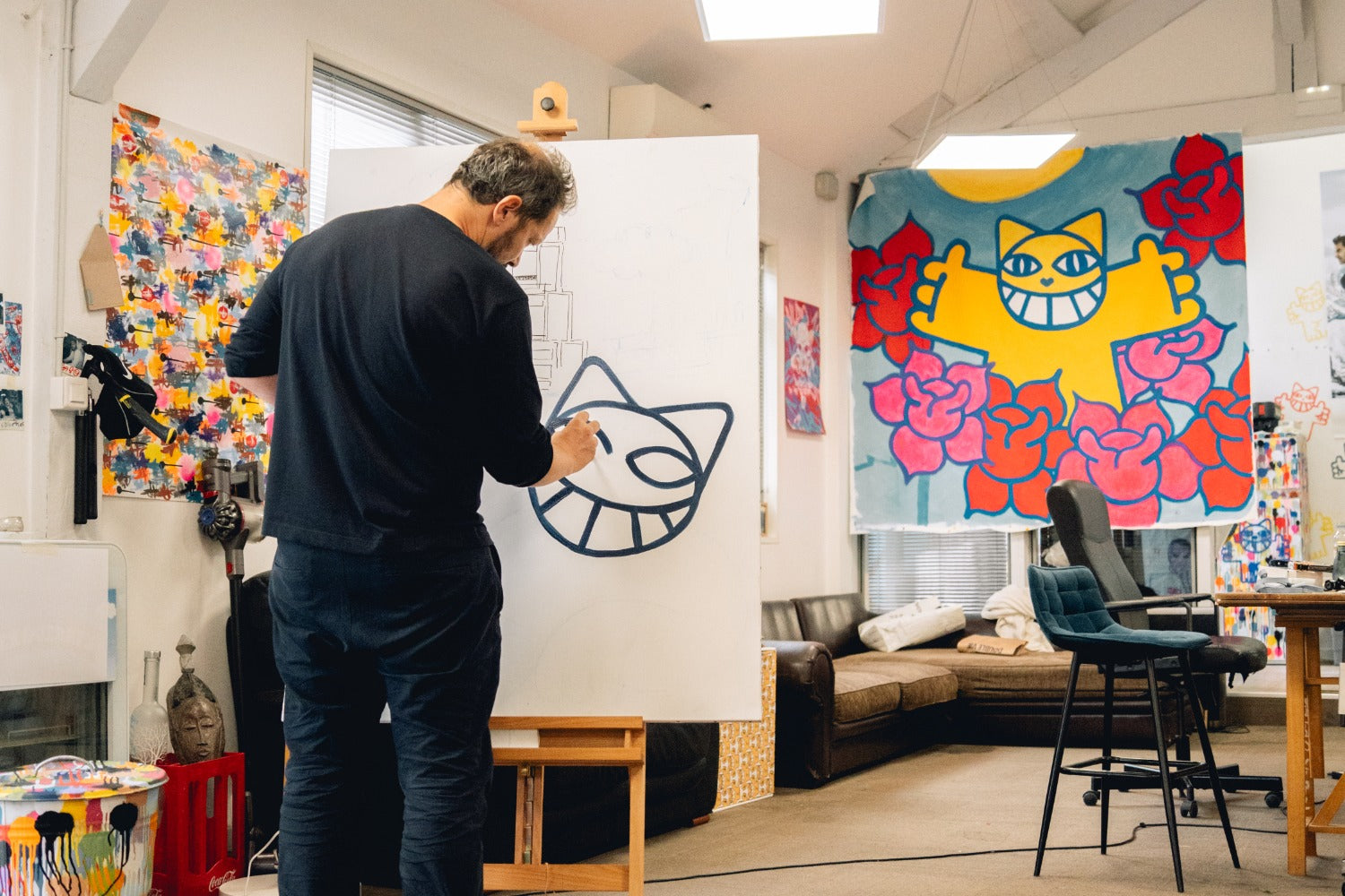 The French-Swiss artist Mr. CHAT, originally started his street-art career with graffiti in his high school. He studied for a while at the Beaux-Arts before introducing Mr. CHAT to the world in 1997, on the walls of Orleans. Thoma Vuille was at the head of the "Street Art" movement in the early 2000s with his emblematic character Mr. CHAT. Since then, he has painted murals on the walls of Paris, New York, Senegal, Brazil and many other countries. His iconic character has appeared in museums, on t-shirts and even in a coloring book. Thoma Vuille is one of France's most famous street artists and his Mr. CHAT has become a cultural icon in France and around the world.