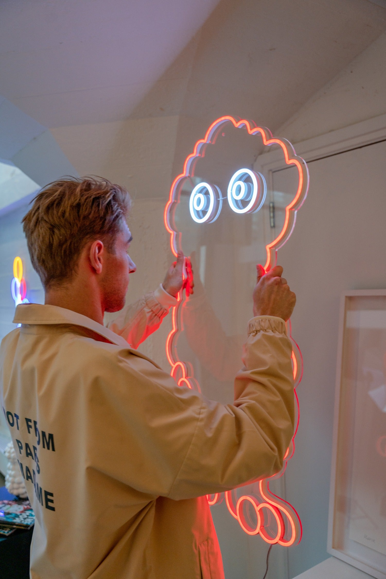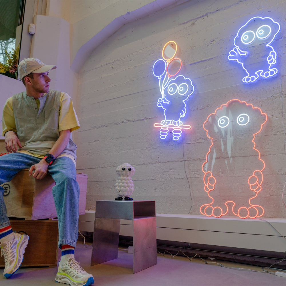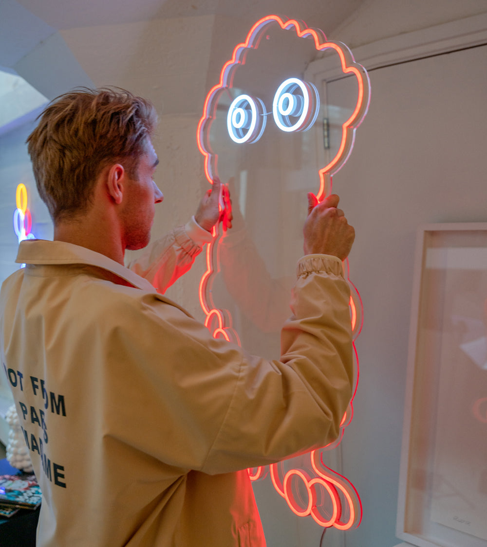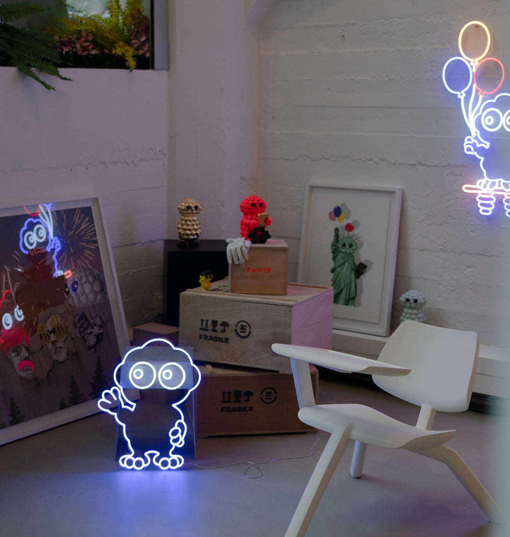 The artist invites us to join his fantastic world with a collection of neon lights featuring his sculptures: Scoop!