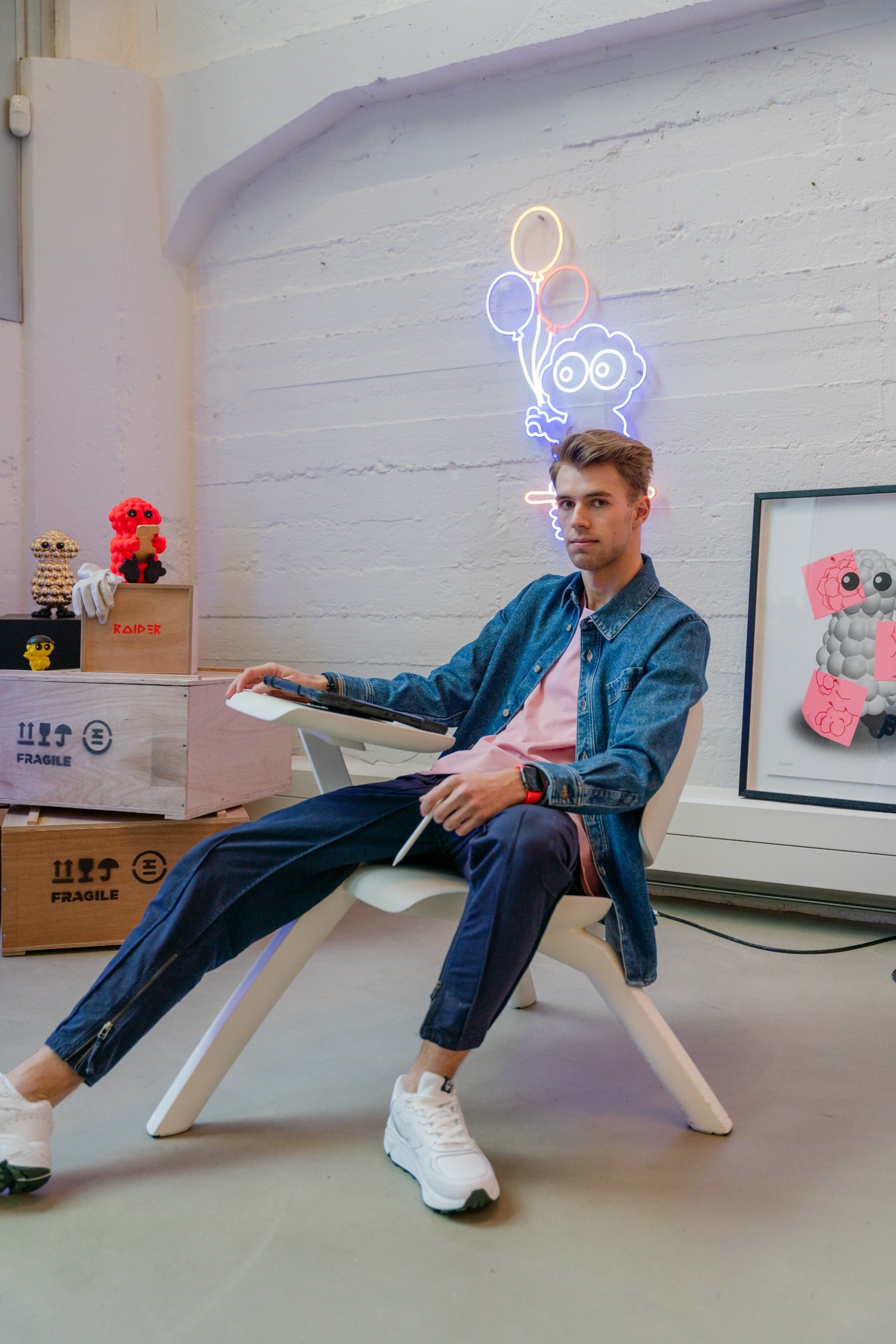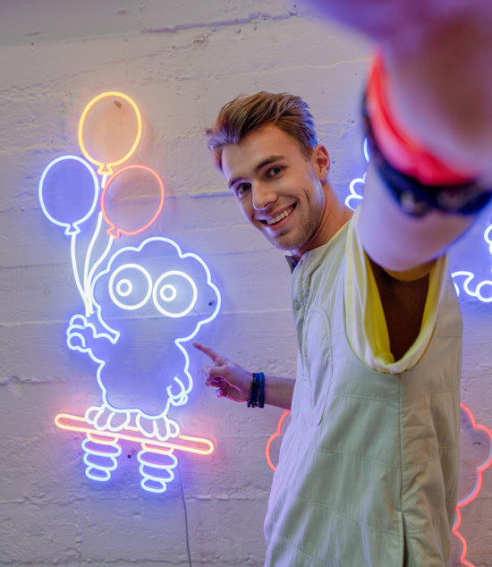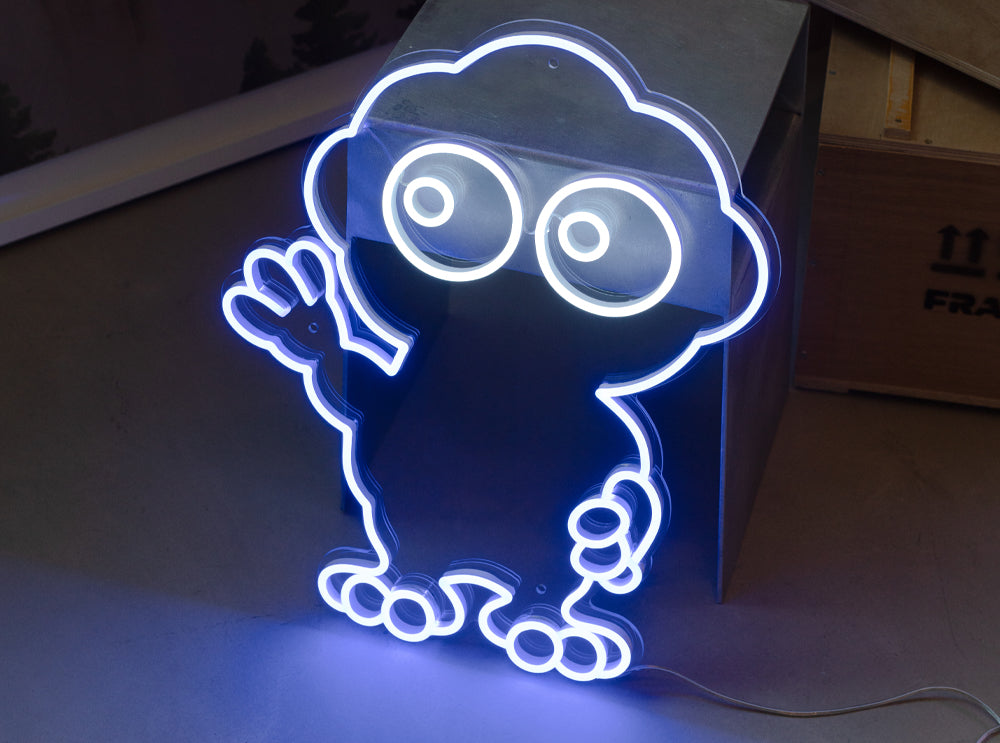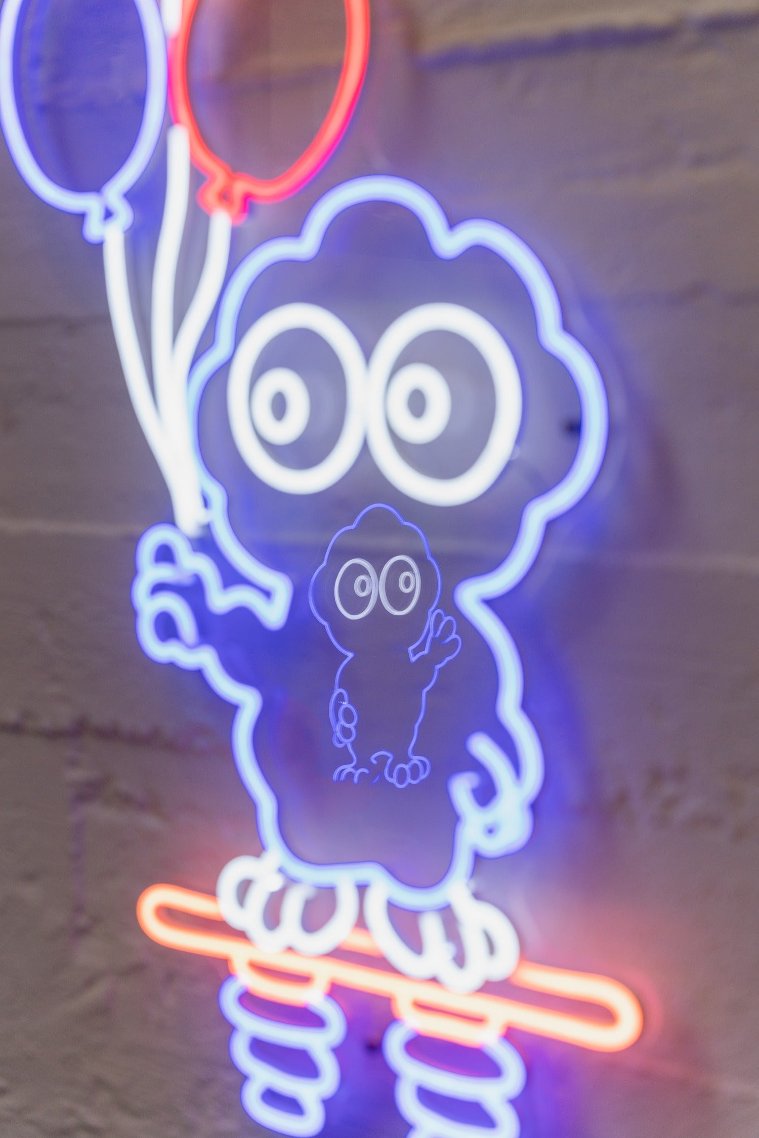 The artist invites us to join his fantastic world with a collection of neon lights featuring his sculptures: Scoop!