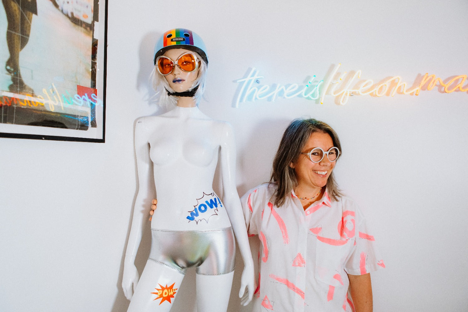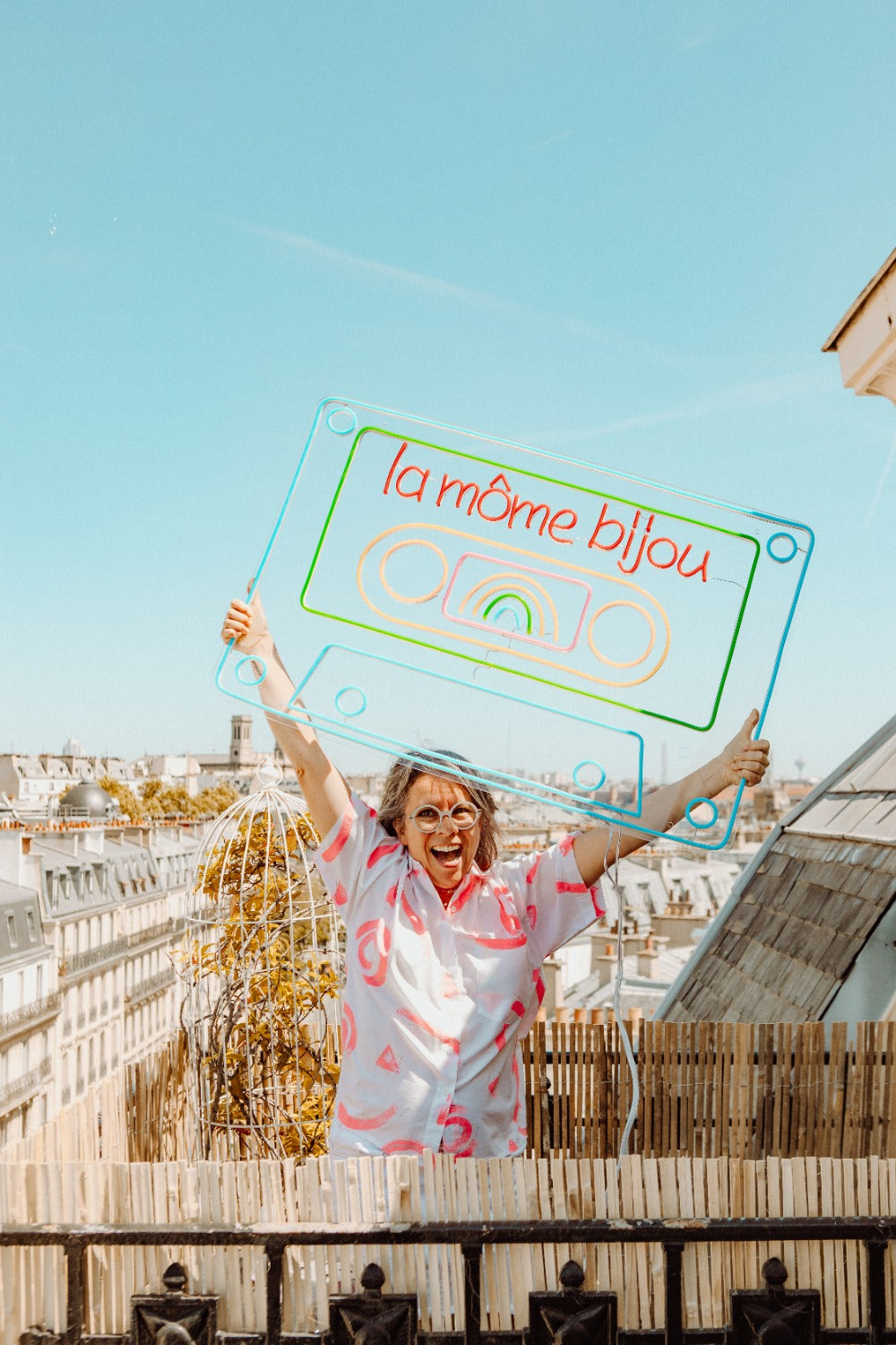 And for her studio, she recreated a neon sign featuring the logo of her brand "La Môme Bijou" within a flamboyantly colored cassette.