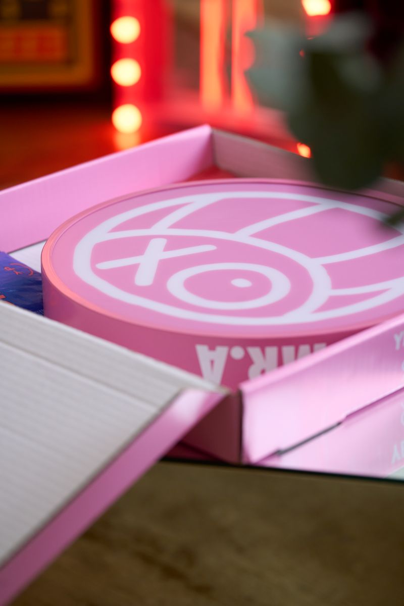 The Mr. A Light Box is a battery-powered LED lightbox featuring a 35 cm panel in brushed aluminum, in André's Pantone pink.