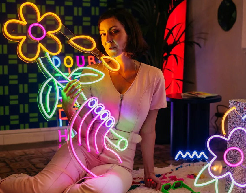 The feminine characters that light up the walls of Spain, Berlin and Hong Kong come to life with our Yellowpop x Emily Eldridge LED neon! This fashionista was illustrated with energetic lines and a geometric ponytail, accessorized with dazzling colors.
