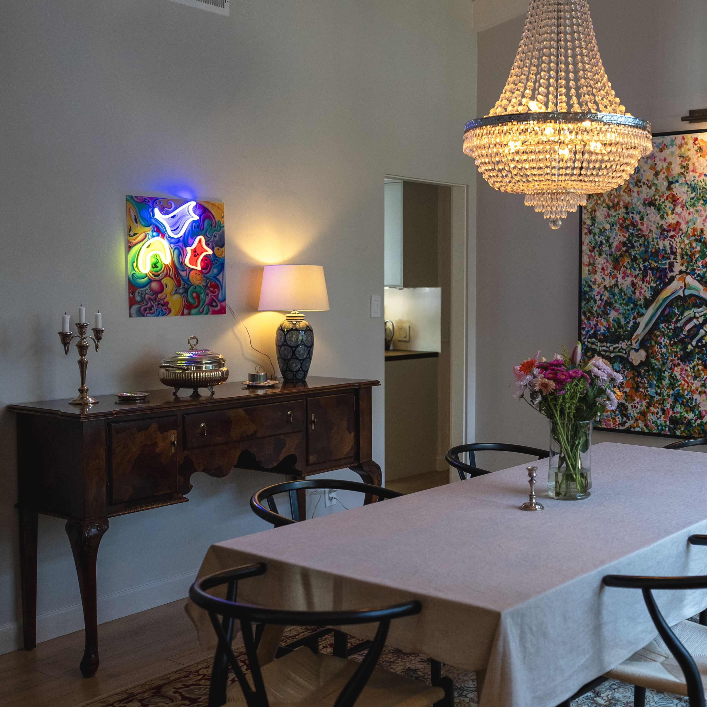 Un néon fait à la main, inspiré par l'univers emblématique de Scharf, monté sur un acrylique transparent pour un effet flottant élégant. Avec une luminosité réglable, cette pièce offre un éclairage personnalisable, idéal pour les espaces modernes ou les collections d'art.