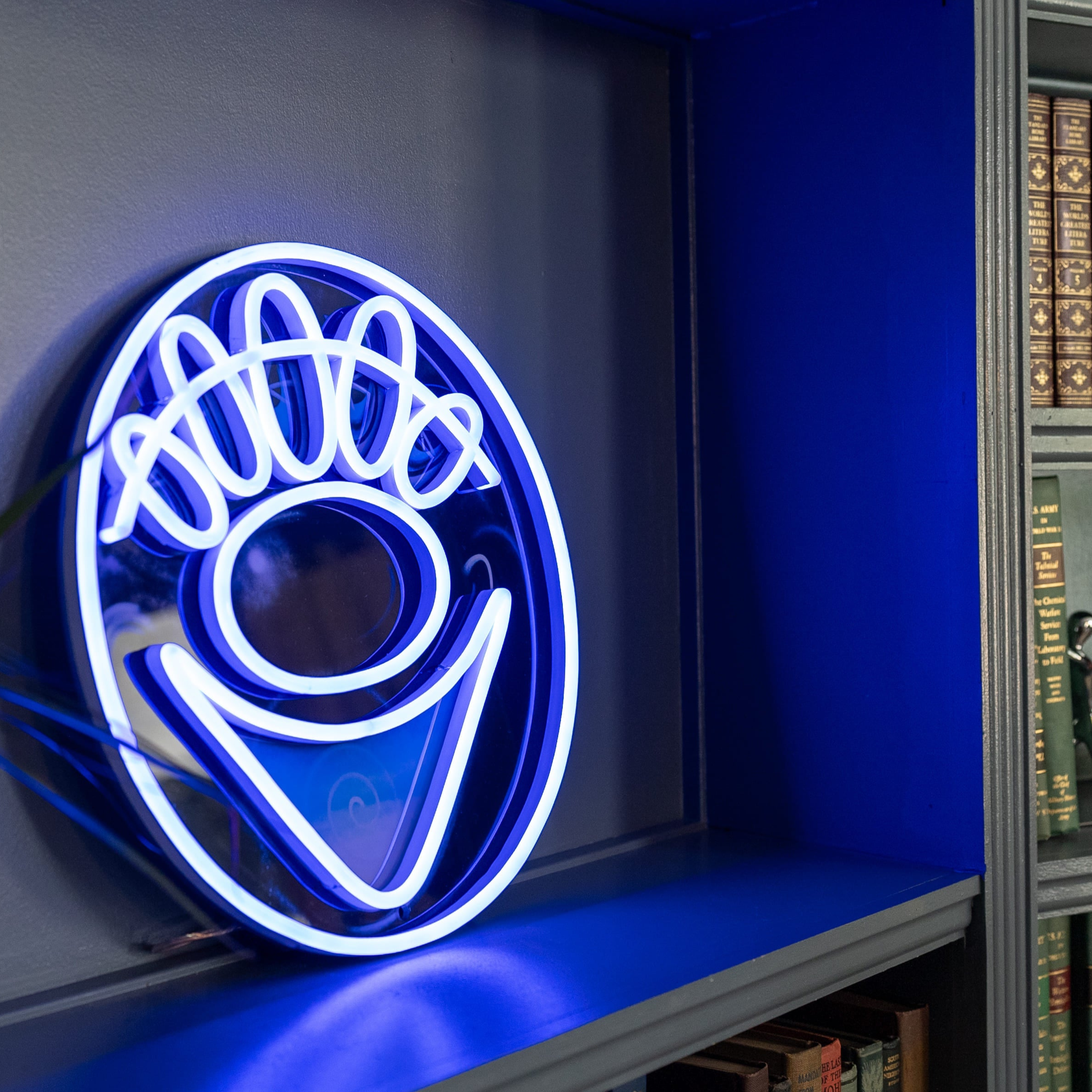 Chaque signe est fabriqué à partir de néons flex de haute qualité contenant des lumières LED. Ils sont tous montés sur un support acrylique recyclé transparent invisible et ensuite clipsé sur une base, elle aussi en acrylique.
